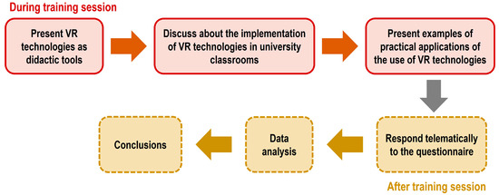 In this work, descriptive quantitative research was carried out on the assessments made by a sample of Latin American university professors of the didactic use of VR technologies. The core of the research consists of the statistical analysis of the comparison of the mean ratings of professors from CABEI countries with respect to professors from non-CABEI countries, and of private universities with respect to public universities. The research process was as follows (Figure 1): The authors provided a training session on the didactic use of VR as part of the data collection phase. After the session, the participants answered a questionnaire, which was used as a research instrument. After validation of the responses obtained (in the sense of checking for completeness), the data collection phase was concluded. These data were subjected to statistical analysis, which were finally discussed and conclusions were drawn.