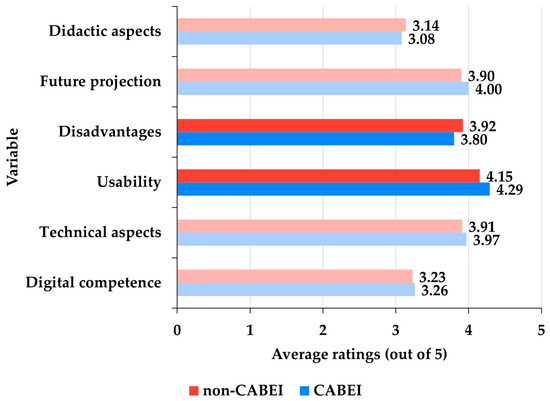Participating professors express an intermediate average level of digital competence for VR use (between 3 and 4 out of 5) but higher ratings for technical and usability aspects (greater than or equal to 4 out of 5), according to the average responses shown in Table 4. On the other hand, the didactic aspects are rated lower than the technical and usability aspects (between 3 and 4 out of 5). Likewise, the level of disadvantage perceived by the professors is close to 4 out of 5. A bilateral t-test was performed to compare the mean ratings between teachers from CABEI countries and teachers from non-CABEI countries, the results of which are shown in Table 4 and Figure 2. Since the corresponding p-values are less than the significance level previously set (0.05) only for the usability and disadvantages variables, it can be concluded that there are significant differences between the mean ratings only for these variables. Specifically, professors from CABEI countries give better ratings of the usability of VR and identify a lower level of disadvantage in its use in lessons than professors from non-CABEI countries (Table 4).