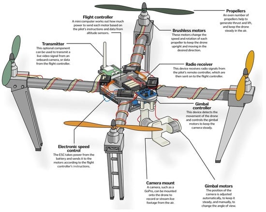 - Vergouw, B.; Nagel, H.; Bondt, G.; Custers, B. Drone technology: Types, payloads, applications, frequency spectrum issues and future developments. In The Future of Drone Use: Opportunities and Threats from Ethical and Legal Perspectives; Springer: Berlin/Heidelberg, Germany, 2016; pp. 21–45. [Google Scholar] [CrossRef]