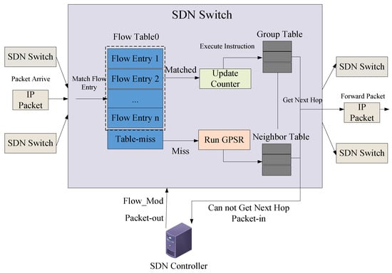 As shown in Figure 1, we integrate the SD-GPSR routing method into the existing SDN architecture. Compared to traditional centralized routing methods, SD-GPSR reduces control overhead and leverages the advantages of the controller in resource monitoring, network security, and QoS. Based on flow table forwarding, it combines the GPSR routing protocol based on geographical location information to offload some routing functions to the data plane for most of the data forwarding.