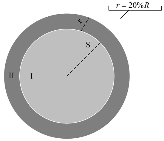 Due to the fact that the GPSR_DA algorithm only considers the angle and distance when selecting the next hop node, it is highly likely to select a node with a very small angle at a very close range from the source node, resulting in the minimum calculated . This may cause the selected next hop node to be very close to the source node but very far from the destination node, thus increasing the number of forwarding hops. Therefore, we divide the communication range of node S into different regions, as shown in Figure 4.