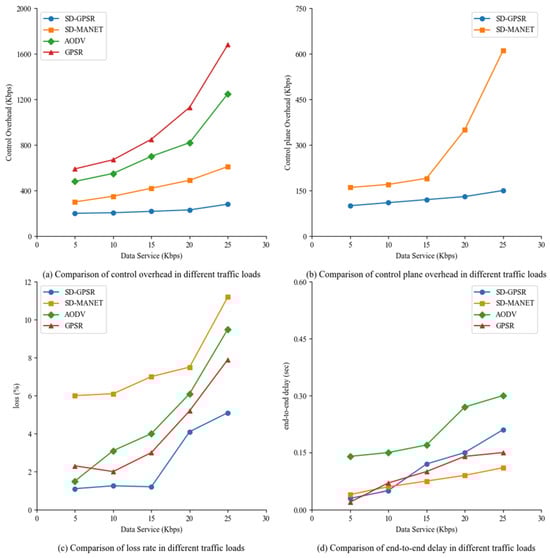 In Figure 5a, the control overhead for all four routing methods increases with the increase in traffic load. AODV exhibits exponential growth in control overhead due to its broadcast-based route establishment, which becomes more pronounced with higher traffic loads. GPSR also shows exponential growth in control overhead, mainly because of the increased frequency of broadcasting location probe packets in the network. SD-GPSR and SD-MANET exhibit relatively smoother increases in control overhead.