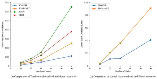 Figure 6 compares the control overhead of the four routing methods in different scenario scales. From Figure 6a, it is evident that the control overhead of all four routing methods increases as the scenario scale grows. AODV’s control overhead exceeds 6000 Kbps in the 96-node scenario. This is mainly because the number of nodes in the scenario increases, leading to more neighbor nodes for each node and consequently increasing the number of hops required from the source node to the destination node. The increased number of broadcasting RREQ messages significantly contributes to the generation of control overhead. GPSR incurs substantial control overhead due to the broadcasting of one-hop beacons and location probe packets, which also increase with the scenario scale. In terms of control overhead between the control plane and the data plane, SD-GPSR exhibits a relatively gradual increase, while SD-MANET experiences a significant increase in control overhead with the increase in the number of nodes, as evident from Figure 6b. SD-GPSR primarily incurs overhead from reporting node positions and obtaining destination node positions. On the other hand, SD-MANET needs to maintain the network topology, including reporting its own one-hop and two-hop neighbor information, resulting in a much larger overhead compared to SD-GPSR’s position and neighbor information reporting. Additionally, SD-MANET constantly calculates route paths and issues flow tables during network operation, leading to higher overall control overhead compared to SD-GPSR.