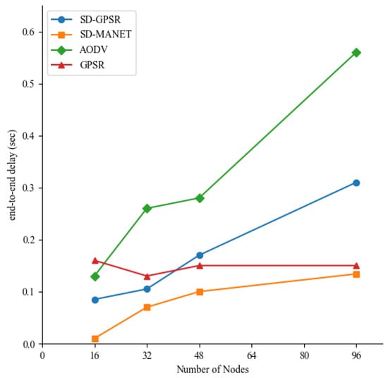 Figure 8 compares the average end-to-end delays of the four routing methods in different scenario scales. As the scenario scale increases, the average end-to-end delay of GPSR is initially high at 16 nodes, but it decreases when the scenario scale reaches 32 nodes. However, it gradually increases with the increase in the number of nodes. On the other hand, the average end-to-end delays of AODV, SD-MANET, and SD-GPSR also increase gradually with the increase in the number of nodes.
