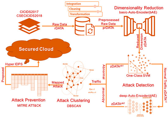 The proposed model for intrusion detection and prevention (IDP), which integrates bAE + OCSVM + dAE + DBSCAN + ATT&CK, referred to as hybrid IDPS, has been meticulously designed with a comprehensive structure encompassing key phases in the realm of cybersecurity. The model’s framework includes traffic data preprocessing, feature extraction, training the detection model, conducting anomaly detection, and clustering and preventing attacks. This model adopts a hybrid approach, integrating a deep learning algorithm that incorporates various techniques for enhanced cybersecurity measures.