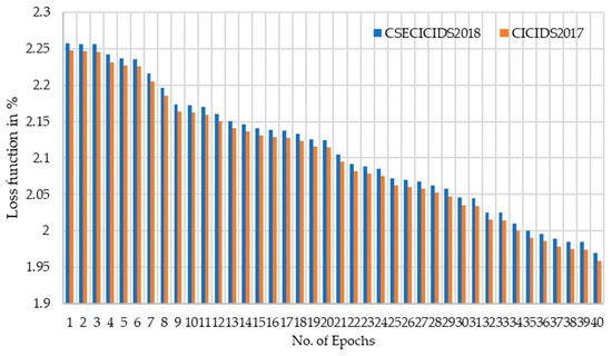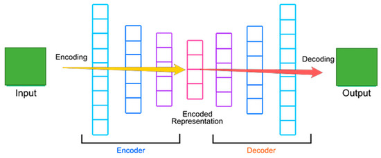 Operating through the iterative process of backpropagation, the deep autoencoder leverages training data results to learn, involving both decoder and forward propagation phases. These phases constitute stages of the encoder, visually depicted in Figure 5. With a Z-dimensional vector, the encoder function (e) is defined in Equation (6). Encoded data undergo processing, reverse-propagating for decoding using the original data. The decoder function (d) is parameterized as shown in Equation (7), enabling multiple encode and decode processes on hidden layers. During training, the objective is to minimize the mean squared error between the input data and the reconstructed output. This ensures that the model effectively captures the key features and patterns of normal traffic. This reconstruction error indicates the model’s ability to accurately reconstruct normal data.