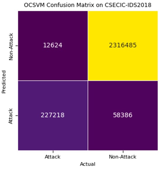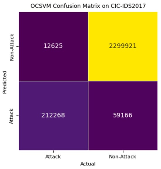 This proposed OCSVM demonstrates a precision of 0.7820, indicating that 78.2% of its positive predictions were correct, and a recall of 0.9439, successfully identifying 94.39% of the actual anomalies. Its specificity is 0.9749, showing that it correctly identified 97.49% of normal instances, and it achieves an F1-score of 0.8554, demonstrating a balanced trade-off between precision and recall. OCSVM demonstrates an accuracy rate of 97.22%, indicating that nearly 97.22% of predictions were correct. It also exhibits a false negative rate (FNR) of 0.0561, implying that approximately 5.61% of true anomalies were not detected. Among the three methods, OCSVM stands out with notably better recall and a lower false negative rate compared to the others. This highlights its strong capability in effectively identifying true anomalies.