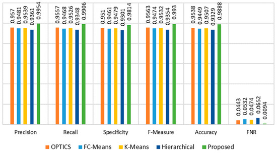 Figure 17 illustrates that the proposed method outperforms others in the CSECIC-IDS2018 dataset, showcasing higher F1-score, recall, precision, FNR, and accuracy. The proposed approach achieves the highest overall correctness of clustering at 0.9881. The proposed approach achieves the highest F1-measure at 0.993, signifying a well-balanced performance between precision and recall.