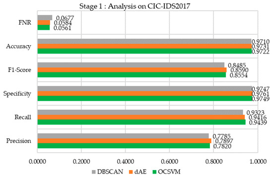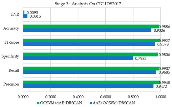 Performance comparison of stage-3 clustering OCSVM + dAE + DBSCAN on CIC-IDS2017.
