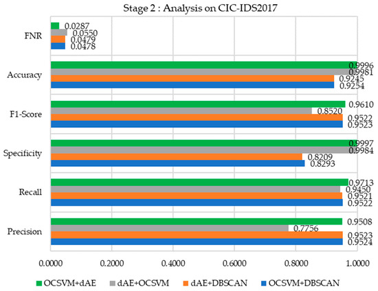 The pairing of OCSVM and DBSCAN achieves high precision and recall but shows decreased specificity, characterized by a lower false negative rate (FNR). The combination of dAE and DBSCAN shows comparable performance, marked by notable enhancements in precision and recall. The combination of dAE and OCSVM achieves high recall but at the cost of relatively lower precision. The combined method of OCSVM and dAE shows substantial improvements in precision, recall, and exceptional specificity, resulting in a notably low false negative rate (FNR). This OCSVM + dAE approach is proposed for stage 2 consideration.