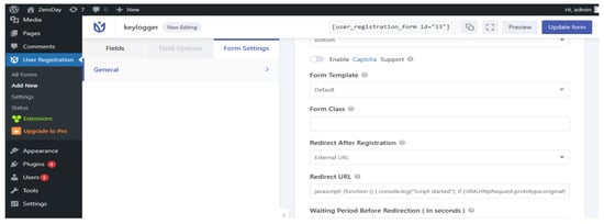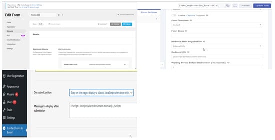 For the “Forminator” plugin, the “Submission Behavior” option was configured to “Redirect user to URL”, embedding the JavaScript into the submission process. Similarly, in the “User Registration” plugin, the JavaScript code was appended to the “Redirect After Registration” option using the External URL selection. Finally, for the “Contact Form Email” plugin, the JavaScript code was incorporated into the “On submit action” event within the “Stay on the page & display a classic JavaScript alert box” setting. Figure 3 shows the specific locations in the configuration where changes were made to allow JavaScript code execution and exploit the XSS vulnerability.