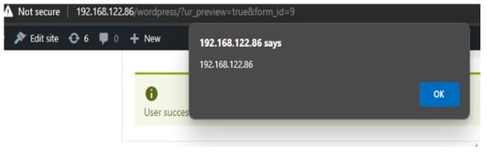 As an example, Figure 4 illustrates how the “User Registration” plugin processes user registration information. This plugin is commonly used to collect essential details from new users, such as usernames, passwords, and email addresses. When subjected to our XSS vulnerability tests, the plugin revealed a significant flaw. Specifically, it triggered the execution of malicious JavaScript code, as shown in Figure 5. This JavaScript code demonstrates how an attacker could exploit this vulnerability to inject harmful scripts into the user registration process. The ability of the plugin to process and accept user inputs without proper sanitization or validation allows these scripts to execute. This scenario can lead to severe consequences, such as unauthorized data access, session hijacking, or the compromise of user credentials. The vulnerability essentially creates a backdoor for attackers to manipulate the registration process and gain unauthorized access to sensitive information.