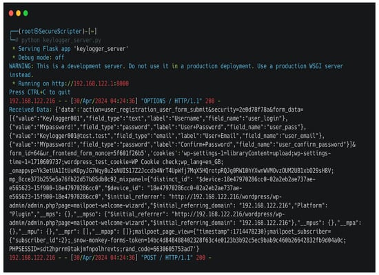 The pseudo-code for the keylogger attached to the client side is presented in Algorithm 1, providing a comprehensive outline of the keylogger’s operation, detailing the steps involved in capturing and transmitting sensitive information from the target system to the attacker’s server. Algorithm 2 shows the code executed on the server side, responsible for retrieving the data captured by the keylogger, filtering, and storing it for future use.