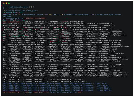 In this study, three distinct tasks were conducted to evaluate system vulnerabilities: port scanning, installing a keylogger on the client interface, and transmitting malware. The keylogger was strategically deployed within the “Forminator” and “User Registration” plugins to extract sensitive information. However, due to the specific functionality of the “Contact Form Email” plugin, a different approach was necessary. This approach focused on examining its potential to introduce malware rather than focusing exclusively on data retrieval.