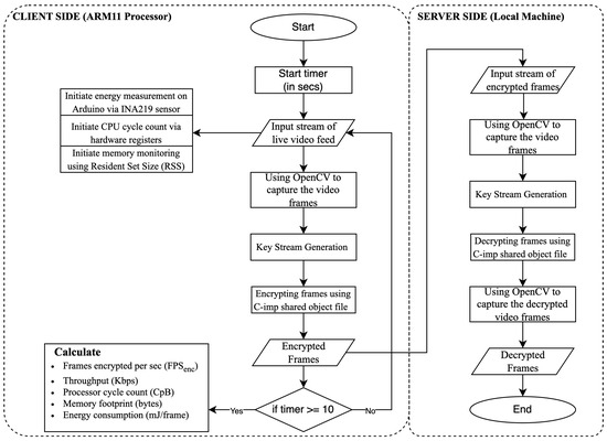- Input Processing: The system is designed to prompt user input specifying the selected LWSC at the server side and client side. The client-side comprises the Raspberry Pi Zero connected with a camera module, while the server side consists of the local machine connected through the local network. The user input prompt invokes the OpenCV (Open Source Computer Vision Library) [20], which provides a wide range of functionalities for image and video processing tasks. In our case, we opted for the stripped-down version of the OpenCV library on the client side to accommodate the limited resources of the Raspberry Pi Zero. The program uses the library to capture frames for input processing (encryption) on the client side. Subsequently, these encrypted frames are transmitted to the server side, which may function as an edge node; however, in our case, we are conducting the experiment within a local network environment. On the server side, the received encrypted frames serve as input for decryption processing.