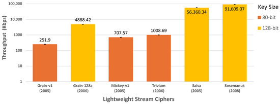 - Ertaul, L.; Woodall, A. IoT security: Performance evaluation of grain, mickey, and trivium-lightweight stream ciphers. In Proceedings of the International Conference on Security and Management (SAM), Las Vegas, NV, USA, 17–20 July 2017; pp. 32–38. [Google Scholar]