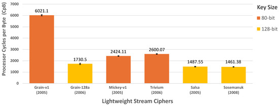 The performance analysis of the selected LWSCs, as illustrated in Table 1, indicates that Sosemanuk and Salsa demonstrate the highest throughput, lowest CpB, and lowest energy consumption. This can be attributed to their software-optimized architectures. Sosemanuk incorporates features of both synchronous stream and block ciphers, allowing the more direct mapping of data on the processor registers, which improves its initialization speed and performance efficiency. Salsa, on the other hand, utilizes a refined structure involving addition modulo, bitwise XOR, and constant distance rotation, making it highly efficient for software implementation. This demonstrates that Salsa and Sosemanuk leverage arithmetic and logical operations that align effectively with CPU instructions, enabling them to execute efficiently within software implementation. Contrarily, hardware-oriented LWSCs such as Grain, Mickey-v1, and Trivium generally exhibit lower software performance efficiency. The efficiency of these structures arises from their utilization of shift registers and feedback loops, which can be implemented using a minimal number of transistors that can operate in parallel with high efficiency in hardware. However, adapting this parallel operation to a sequential execution model in software leads to inefficiencies in ARM11-based processors. Moreover, these ciphers function at the bit level, which poses challenges for ARM-based general-purpose CPUs that are designed to handle operations at the byte level. Handling individual bits in software can lead to more intricate and time-consuming operations. For example, Grain, Trivium, and Mickey each undergo two phases: initialization and keystream generation. During initialization, these ciphers load the key and initialization vector into their internal state. Grain and Mickey utilize two shift registers for their operations, while Trivium employs three shift registers. These shift registers, in combination with feedback and non-linear functions, are responsible for generating the keystream. However, when these ciphers are implemented on ARM11-based processors, the need for complex bit manipulation operations like shifting and applying non-linear functions can lead to decreased cryptographic throughput, increased processing cycles, and energy consumption. This is particularly evident in ARM-based byte-oriented CPUs. An exception in this experimentation is Grain-128a, which outperforms the selected hardware-oriented LWSCs due to its speed-optimized design.
