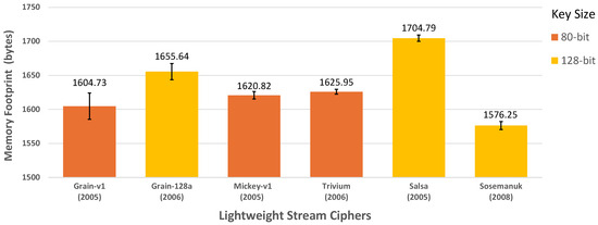 In Figure 6, Salsa demonstrates the largest memory footprint, followed by Grain-128a, while Sosemanuk exhibits the smallest footprint, followed by Grain-v1. Mickey-v1 and Trivium have relatively moderate memory footprints.