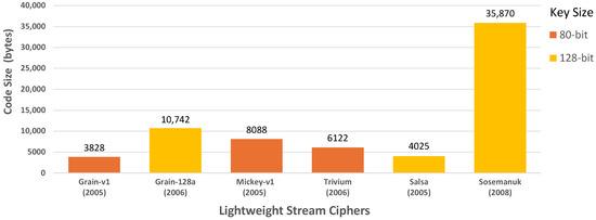 In Figure 7, Sosemanuk displays the highest code size, significantly differing from the other selected LWSCs, with Grain-128a following behind. Grain-v1 has the smallest code size, followed by Salsa, Trivium, and Mickey.