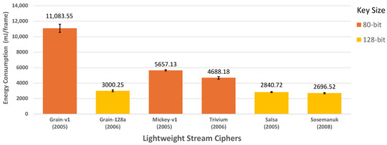 Figure 8 presents the energy consumption measurements of selected LWSCs during the encryption of individual frames within live video feeds. Grain-v1 exhibits the highest energy requirement per frame, followed by Mickey and Trivium. In contrast, Sosemanuk, Salsa, and Grain-128a demonstrate relatively lower energy requirements for frame encryption, with subtle distinctions observed among them.
