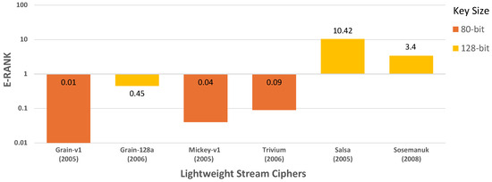In Figure 9, the graph illustrates the E−Rank values for the selected LWSCs. Salsa exhibits the highest E−Rank, with a notable lead over Sosemanuk. Contrarily, Grain-v1 displays the lowest E−Rank, with Mickey and Trivium following behind. Grain-128a shows a relatively moderate E−Rank, positioning it in the middle tier of overall software performance among the selected LWSCs.