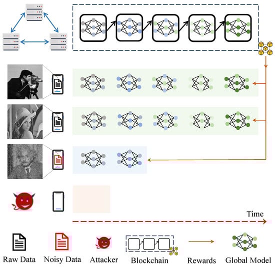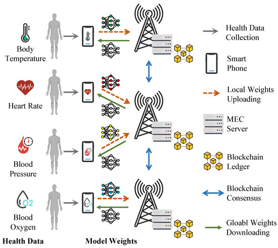 In this work, we focus on the exploration of an affirmative answer to the above question. We aim to give a simple yet effective framework to motivate collaboration for improved QoS at the network edge. Fortunately, distributed machine learning (DML) provides an opportunity to realize collaborative edge intelligence. DML is a paradigm that enables the training of ML models across multiple decentralized edge devices without exchanging private local data samples directly. Federated learning (FL) [4] is a well-known example of collaborative DML. In the context of FL, private and distributed data are not allowed to be shared for privacy reasons, as the model is trained locally by mini-batch stochastic gradient descent (SGD) on each participant’s private data, and only model weights are communicated to a central server for global model aggregation. FL is especially beneficial for AI to learn private information under data regulations [5]. For instance, smart health applications rely on IoT data: especially private health data [4]. Instead of uploading IoT data, users transmit model weights trained from health data for prediction. Despite its privacy preservation feature, FL suffers from free-riding attacks [6,7,8], wherein malicious participants exploit the system by benefiting from the global model without meaningful contributions, thereby compromising the efficiency and fairness of the collaborative learning process. Moreover, FL requires a centralized parameter server, which may constitute a single point of failure (SPOF). Therefore, a decentralized approach is needed to enhance system security and reliability. As a distributed ledger technology, blockchain is a decentralization approach with consecutive timestamps to solve the above issues.
