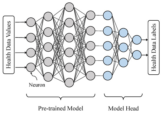 Training a DNN at the network edge is challenging due to resource constraints: IoT devices often lack the computational power required to efficiently perform SGD and backpropagation on large models. To solve this problem, we introduce a pre-trained model framework in Figure 2 for efficient feature extraction [36]. Neurons in gray color are frozen during training and inference. Only the weights of model heads are trainable, i.e., global and local weights in this paper. Instead of training and uploading the whole model, any smartphone n can train and upload the weights of the model head. Utilizing pre-trained models for feature extraction is not novel. As it can significantly reduce computational and communication overheads, we would like to highlight this method for improved QoS at the network edge.