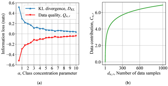 In DML, the marginal utility of data samples diminishes as the quantity of data (i.e., ) increases [34]. This principle of diminishing returns suggests that each additional data sample contributes less to model improvement than previous data samples with the same quality. However, (5) does not account for the diminishing marginal utility. In Section 4.3 and Section 5.1, we propose and discuss alternative methods to approximate in (4) that incorporate the concept of diminishing marginal utility, aiming to reflect the true value of additional data samples more accurately.