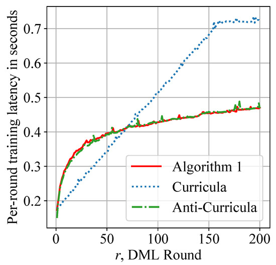Although Curricula achieves similar performance to our design, it uses a significantly greater amount of data samples per round; thereby, training latency is increased. Figure 9 shows the average training latency of each smartphone during DML. Algorithm 1 is observed to reduce the overall training latency by 30% and achieve approximately 50% latency reduction in later rounds. Figure 8 and Figure 9 jointly show the superiority of our data scheduling algorithm.