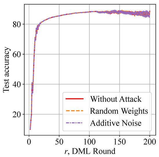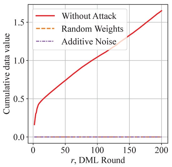 Furthermore, Figure 11 shows the cumulative data valuation of honest contributors without an attack and with free-riders conducting an attack. As attackers do not contribute to the validation accuracy of honest contributors, the data valuation of attackers remains zero. In Figure 11, free-riders try to attack in every round. As the cumulative data valuation of honest contributors increases, it becomes increasingly difficult to mimic an honest contributor and achieve a successful attack. The observation and analysis jointly explain why the QoS of our system does not change under free-riding attacks.