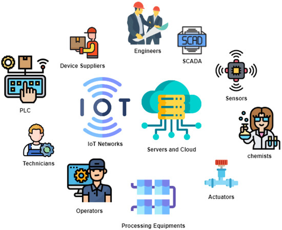 Establishing relationships of trust between these critical elements is essential to ensure the safety and efficiency of the water-treatment process. This implies not only the reliability of the technologies deployed but also the transparency of processes and communications between the players in the system. Mutual trust helps ensure the continued supply of high-quality drinking water to the people. In this Figure 1, we can see a visual representation of the critical elements of the IoT drinking-water treatment plant. Each essential element, such as IoT sensors, PLCs, maintenance personnel, human operators, etc., is represented graphically, providing a clear overview of the plant structure and its key components.