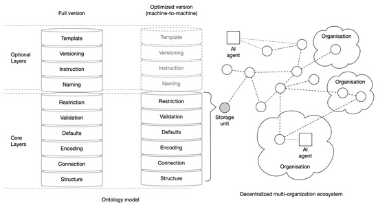 Only the core layers are needed in agent-to-agent interactions, even though a full ontology characterization calls for defining all layers (see Figure 1). Thus, agent-to-agent communication can be optimized by including only the core layers. The entire model version, including the optional layers, is shown on the left side of the following diagram. The optimized version, which contains only the minimum number of layers needed for AI agent communication, is shown in the middle of the diagram.