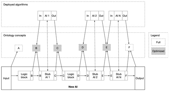 The procedure for connecting AI agents from a logical and structural point of view is shown in Figure 2. Placeholder sequences in the code connect AI agents, forming a composite AI. These placeholders’ inputs and outputs, representing AI agents, are defined and consistent with ontology ideas. This allows a software engineer to create links between agents at the base layer of the diagram and instantiate concepts. The middle layer of Figure 2 contains a decentralized medium where the ontology concepts are structurally stored. These concepts can be incorporated into the base-layer logical models of AIs or the running examples of the agents placed in upper-layer execution environments. However, the concepts for the input and output need to be fully defined because human interaction is their intended use. The internal concepts (shown in gray in Figure 2) can use the optimized versions since the optional layers are not required in machine-to-machine interactions between AI agents communication. In other words, the more extended the chains of composition, the more beneficial the application of the optimized model becomes.