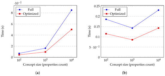 Ten files are included with each concept, one for each concept layer. Furthermore, as seen in Figure 1, a meta-file includes details about the notion and its creator. There is decentralized storage for these files. We employ exponential steps to change the number of characteristics in the structural layer from ten to 10,000 to test the scalability of the system. The number of properties in the naming layer also varies because each property in the structural layer has a unique name. The upper limit of the number of properties in our system is on the order of magnitude of the 30,000 properties listed in ECLASS [40]. The final concept sizes, measured in bytes, were almost KB, KB, KB, MB, and MB after testing.