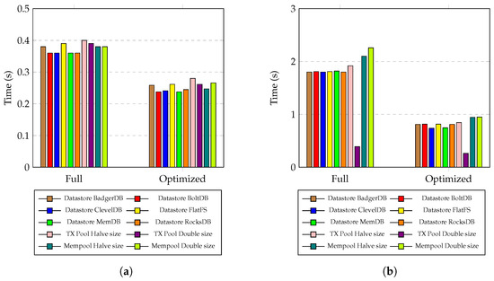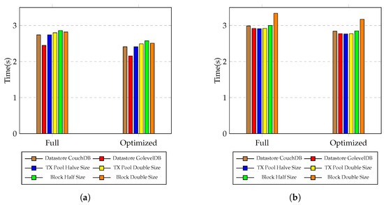 The results were averaged over several iterations. For the transaction and block size variation assessments, a total of 1800 iterations were carried out over the course of 12 h of continuous simulations. Additionally, six hours of continuous simulation time and 900 iterations were needed for the datastore engine variation studies.