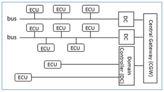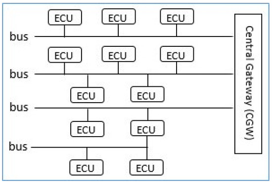 Hierarchical with Central Gateway E/E Architecture—As shown in Figure 1, in this class of architecture, ECUs are installed into different buses interconnected by a central gateway. The hierarchy comes from the assignment of functions to buses with different bandwidths following their real-time and size requirements [27]. The central gateway is responsible to manage the inter-ECU communications and to convert data from one bus format to another bus format [16,27,29].