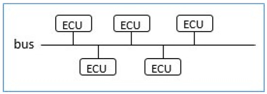 Single Bus E/E Architecture—As shown in Figure 3, in this class of architecture all the ECUs are connected to a single bus. This pattern is suitable for a less complex architecture when a small number of ECUs are used in a vehicle [6,16,27,29].