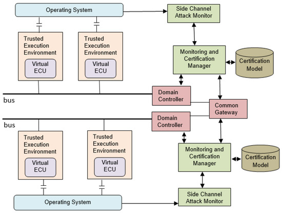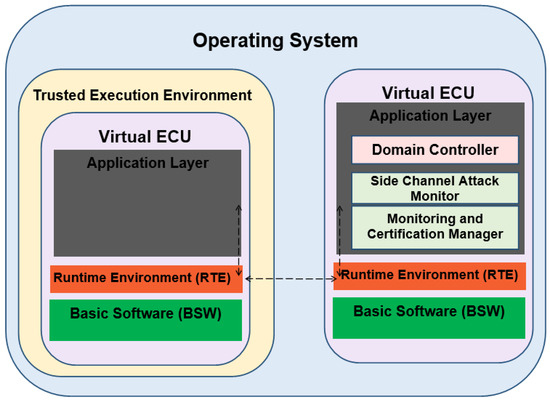 Figure 7 shows the mapping of FIVADMI architecture with the AUTOSAR architecture. The left side (yellow box) of Figure 7 shows the deployment of virtual ECUs within a TEE following the AUTOSAR architecture. The right side of Figure 7 shows the Domain Controller, Monitoring & Certification Manager and Side Channel Attack Monitor components in FIVADMI, developed as Software Components (SWCs) in the application layer of the AUTOSAR architecture. These components reside within a trusted virtual ECU and collect the data transmitted among the virtual ECUs within the vehicle. The collected data is used for monitoring the properties related to different ECUs.