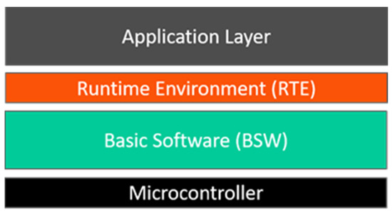 In AUTOSAR, ECU software is abstracted as a layered architecture built on top of the underlying micro-controller hardware [72]. As shown in Figure 5, this architecture is composed of three layers: namely Basic Software (BSW), Runtime Environment (RTE), and Application Layer.