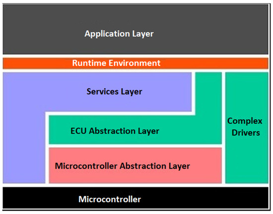 Basic Software Layer (BSW): this layer provides core system functionalities. As shown in Figure 6, this layer has 3 sub-layers, (i) Micro-controller Abstraction Layer (MCAL)—contains internal drivers modules that access the micro-controller and internal peripherals directly, (ii) ECU Abstraction Layer (ECUAL)—interfaces the drivers of the MCAL and offers an API for accessing peripherals and external devices, thus making higher software layers independent of the hardware layout, and (iii) Services Layer (SL)—provides top level services (e.g., operating system, communication, management, and memory services) to application software components.