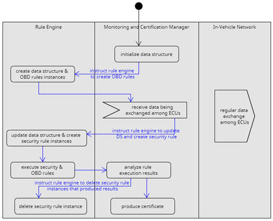 The UML activity diagram shown in Figure 8 presents high level view of the FIVADMI monitoring and certification process. The Monitoring and Certification Manager collaborates with a Rule Engine and with the IVN. The Monitoring and Certification Manager receives the regular data exchanged among ECUs and forwards them to the Rule Engine to verify the rules corresponding to the security and behavior policy. In the sequel, security properties and behavioural properties are denoted as security rules and as OBD rules respectively.