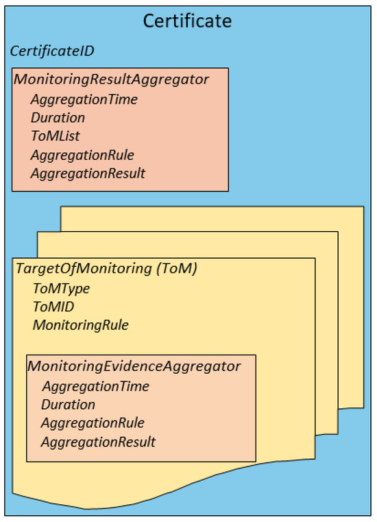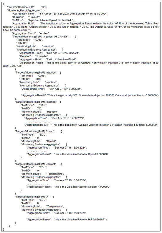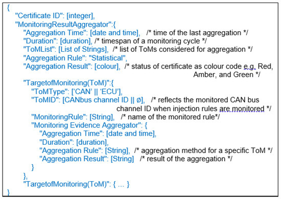 In FIVADMI, the Monitoring and Certification Manager and the Side Channel Attack Monitor perform real-time monitoring of security properties related to ECUs and of behavioural properties of the vehicle to detect anomalies. These components then produce a certificate to certify the valid state of individual ECUs and of the overall IVN. Figure 9 shows a high-level structure of the corresponding certificate.