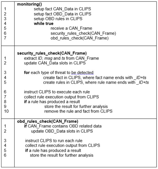 At first, the Monitoring and Certification Manager creates the data structures to store runtime data received from the IVN. It then instructs the Rule Engine to create new instances for the OBD rules, with the corresponding data structures inside the Engine.