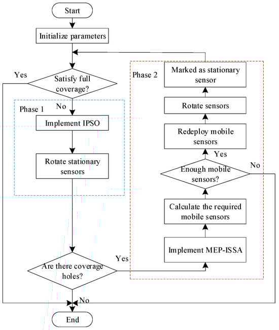 After rotating the stationary sensor, we expanded the total coverage area of the sensors, but there are still coverage holes in the network. Therefore, the task of this stage is to repair coverage holes and achieve coverage enhancement by redeploying mobile nodes. Our mobile node redeployment plan consists of the following steps: using MEP-ISSA to search for repair paths, calculating the number of required mobile sensors, and redeploying mobile sensors.