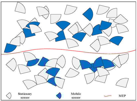 In recent years, MEP methods have been applied to address coverage enhancement problems. Early research on the MEP focused on how to determine the path with the worst network coverage without applying the MEP to coverage optimization [,]. Bonnah et al. [] first applied the MEP method for coverage optimization. Their method achieves coverage enhancement by adding sensors on the MEP. Cai et al. [] used the PSO algorithm to search for the MEP and solve the coverage enhancement problem in DSNs. Both methods above can only schedule one sensor at a time, which is inefficient and prone to new coverage holes, resulting in limited coverage. The existing MEP-based methods have shown good results in improving coverage, but there are still problems with energy consumption, efficiency, and other aspects.
