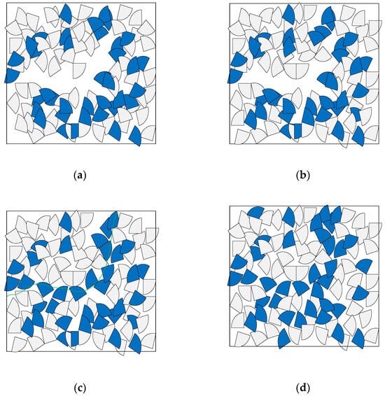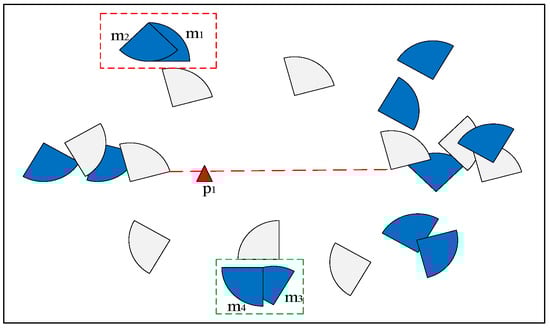 Figure 5 shows a visual example of executing the proposed method. In this simulation experiment, stationary and mobile sensors were randomly deployed in an ROI of size 200 m × 200 m. The gray sector in Figure 5 represents the stationary sensor, while the blue sector represents the moving sensor. The green curve represents the MEP that was searched for. Figure 5a shows the initial state of the sensor. Figure 5b shows the result of adjusting the sensing direction. The result of one iteration of the algorithm is shown in Figure 5c. The final result after the iteration is shown in Figure 5d.