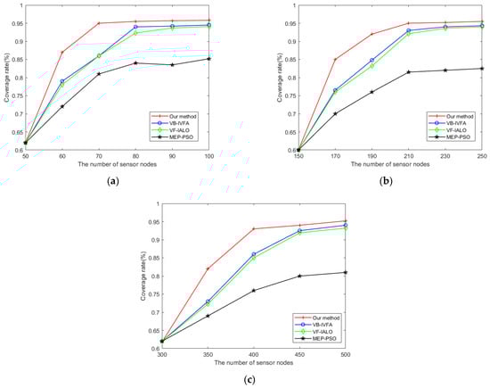 Comparison of coverage rate under various numbers of sensors: (a) ROI = 100 m × 100 m, (b) ROI = 200 m × 200 m, (c) ROI = 300 m × 300 m.