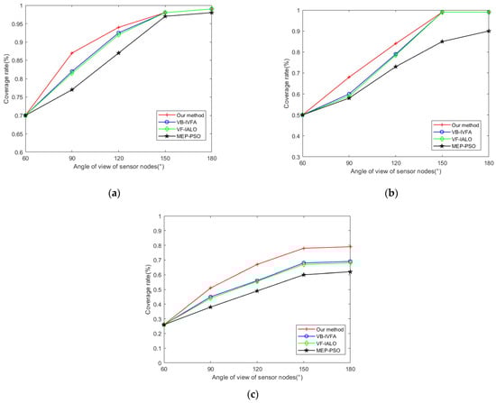 Comparison of coverage rate under various sensing angles: (a) ROI = 100 m × 100 m, (b) ROI = 200 m × 200 m, (c) ROI = 300 m × 300 m.