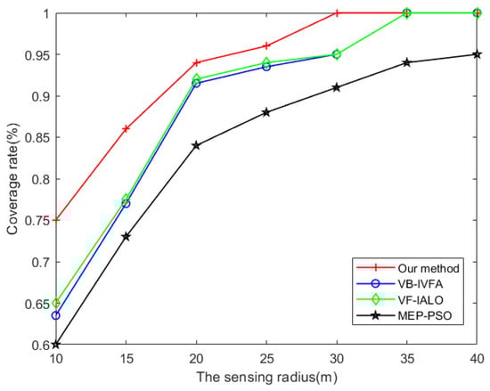 As shown in Figure 6, when the number of sensors is small, the coverage of all four algorithms is low. When the density of sensors is low, not enough schedulable mobile sensors can be found, resulting in some coverage holes that cannot be repaired. With the increase in the number of sensors, the coverage rate of all four algorithms is greatly improved. Under the same conditions, our method outperforms the other three methods in terms of coverage rate. VB-IVFA, VF-IALO, and MEP-PSO only use mobile sensors for coverage enhancement without considering rotating sensors. Our method adds the step of rotating the sensor, so it has a certain advantage in terms of coverage rate.