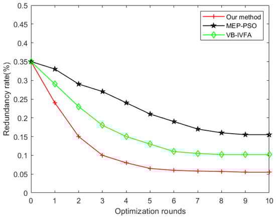 In this section, we also compared the redundancy rate and redundancy area of different algorithms. As shown in Figure 10, the proposed method reduces the redundancy rate to below 10% after multiple iterations, which is significantly better than other methods. Because the MEP-PSO algorithm can only optimize the redundant coverage of two nodes at a time, its redundancy rate is higher than that of the other methods.